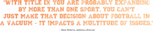 “With Title IX you are probably expanding by more than one sport – so you have that additional investment in support, equipment, staff and facilities for that sport. You can’t just make that decision about football in a vacuum – it impacts a multitude of issues. It’s not as easy as it appears on the surface.”