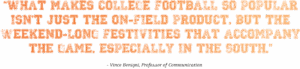 “What makes college football so popular isn’t just the on-field product, but the weekend-long festivities that accompany the game, especially in the South,” says Benigni. “College football is the most significant source of student and alumni engagement, representing the passion and pride of a university through a traditional weekly outlet.”