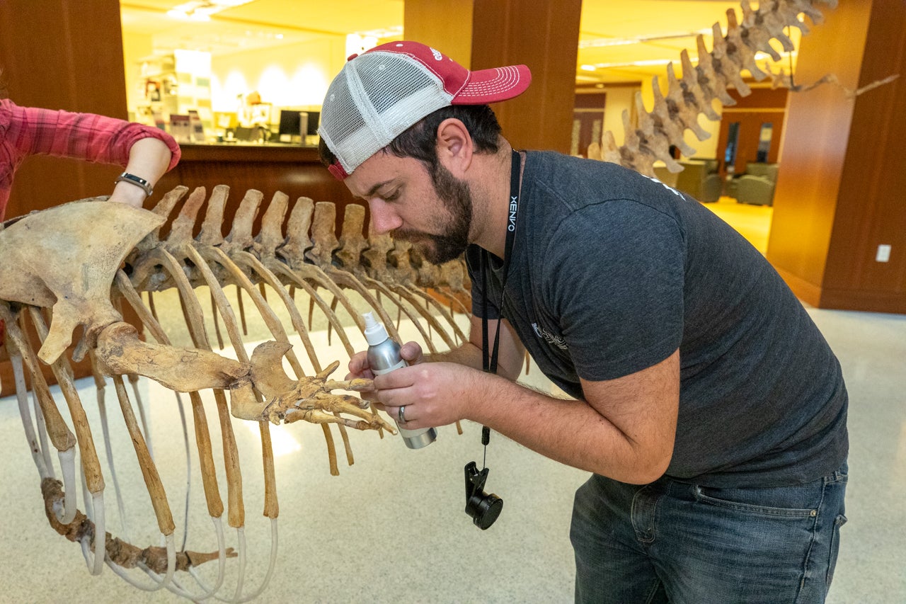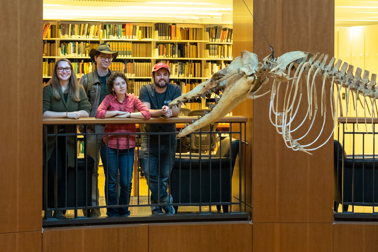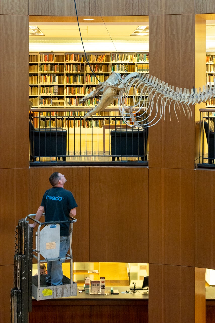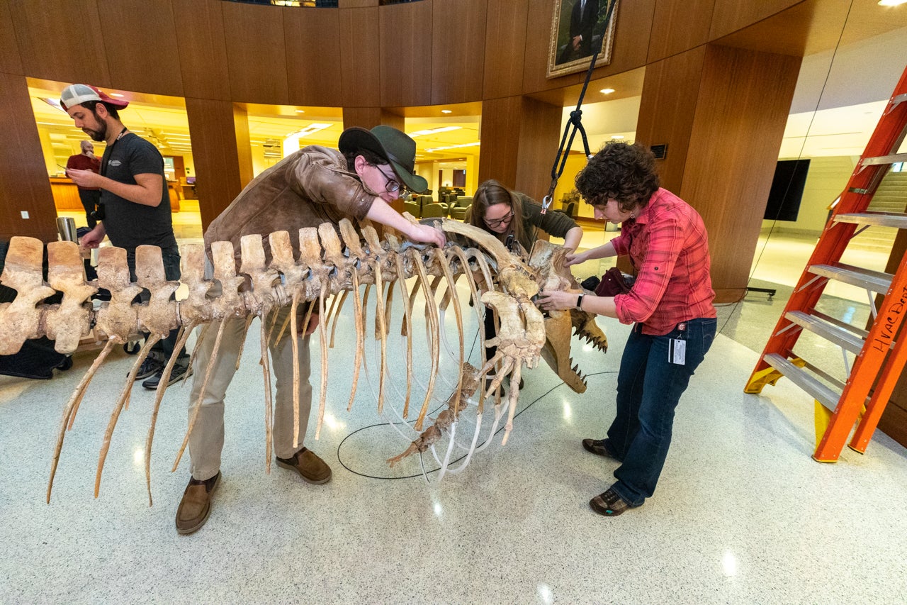 An ancient whale made a big splash in the rotunda of Addlestone Library last month. The Dorudon atrox skeleton will be on view in the library through December 2020. Photos by Heather Moran