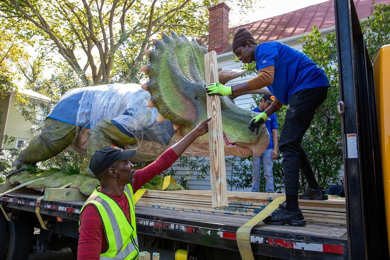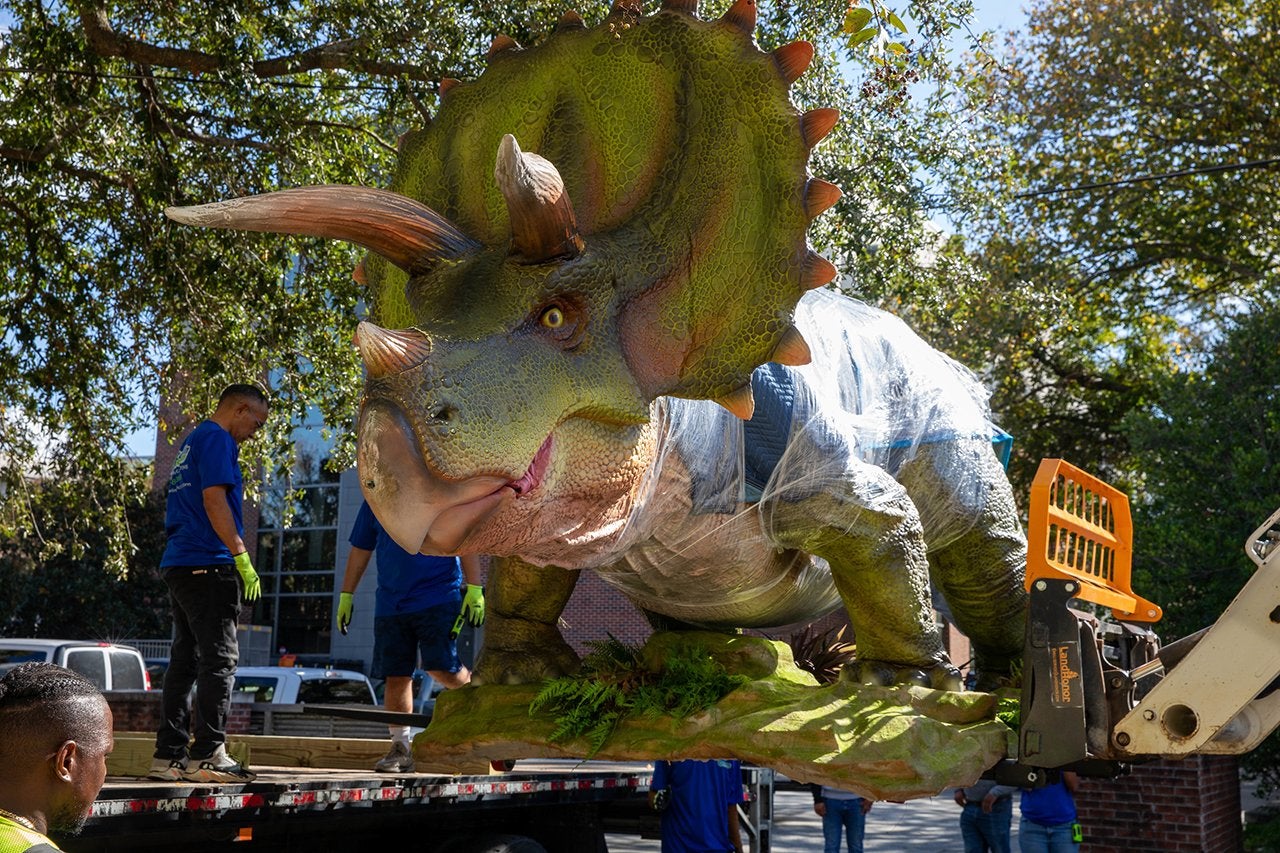 Top: Vice President Kamala Harris visits campus as part of her Fight for Our Freedoms college tour. Bottom: Three large-scale animatronic dinosaurs were delivered to the College of Charleston’s Mace Brown Natural History Museum at the School of Sciences, Mathematics, and Engineering. (Photos by Mary Muldoon)